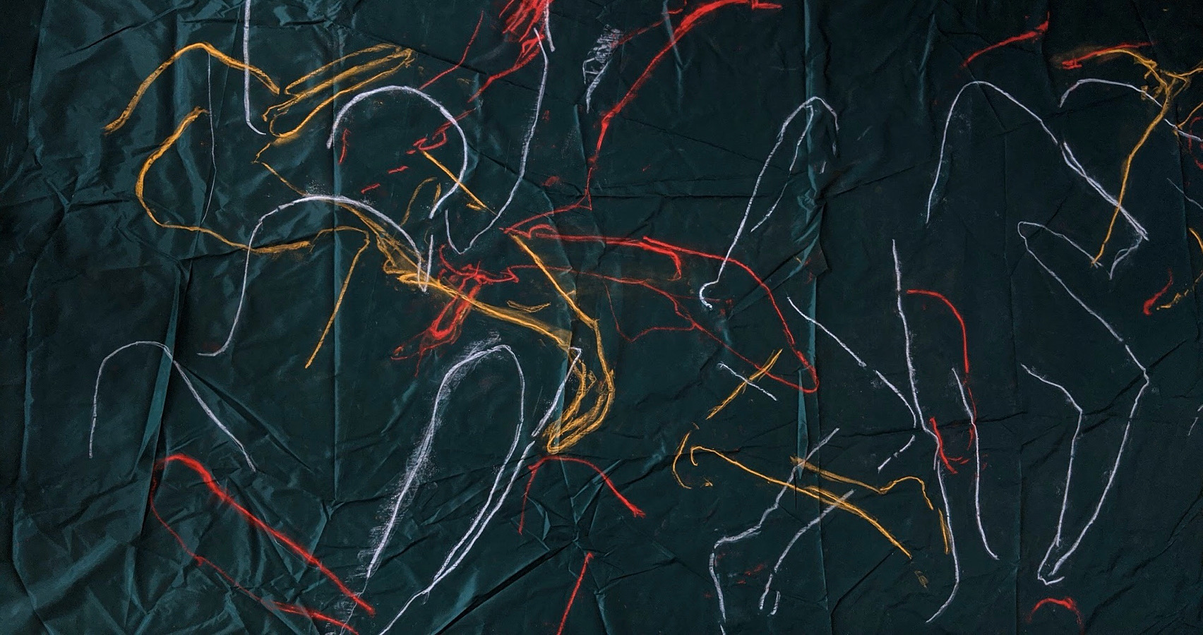 Scrimmage, chalk and pastel on fabric, 6’ x 7', 2020