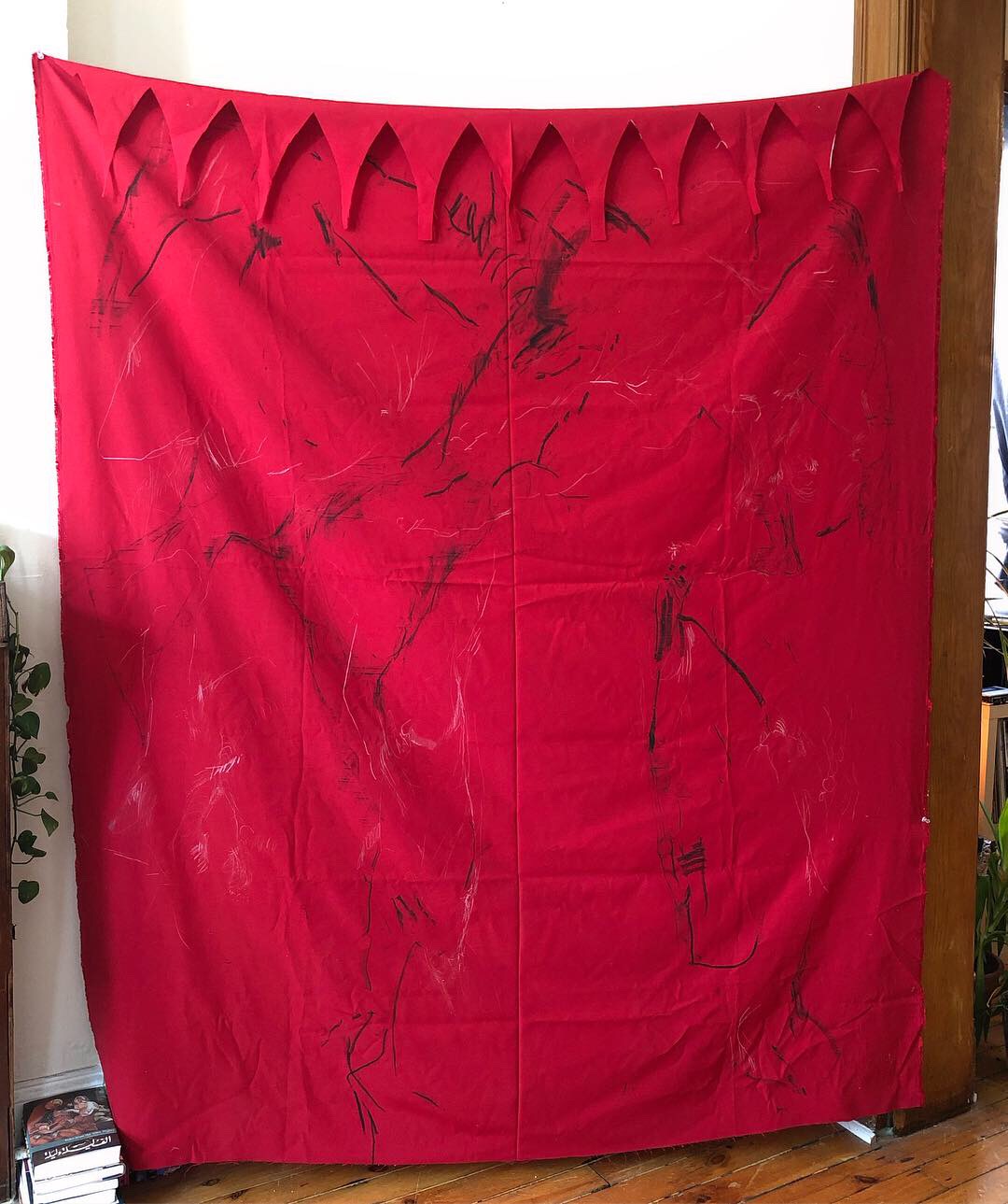 Uncongratulations, piece 1 and 2 made sequently on the floor through improvised movements and body tracings, charcoal and chalk on fabric, 2019